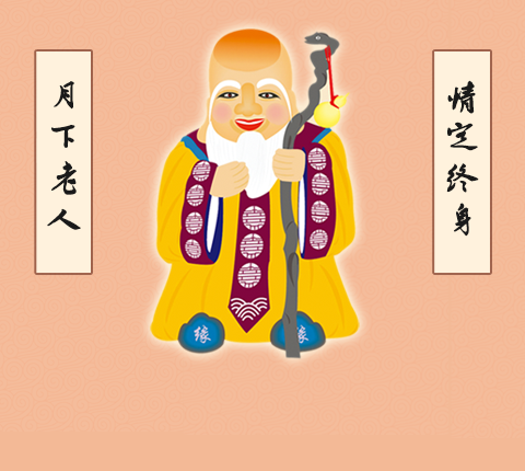 月下老人,又称【月老】,据沈复《浮生六记》说:一手挽红丝,一手携杖悬婚姻簿,童颜鹤发,奔驰开非烟非雾中。月老在中国民间是一个家喻户晓的人物,他主管着世间男女婚姻,在冥冥之中以红绳系男女之足,以定姻缘。