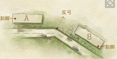 住宅不要处于Y形路口,住宅正处于Y形路口,被两条路斜夹,车辆往来的气场如暗箭一般冲击住宅,对居住者非常不利,风水学上为一种严重的路冲煞,不适于居住。