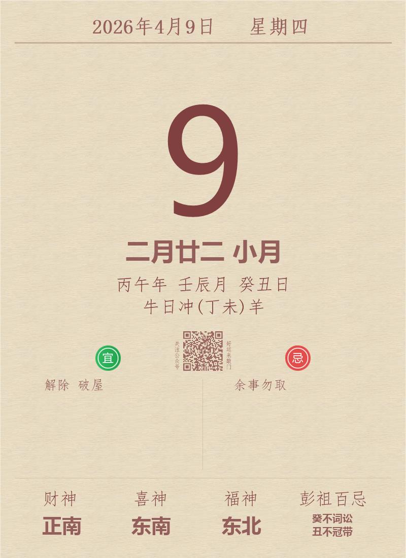 今日老黄历(2026年4月9日):黄历宜忌、财神方位、特吉生肖、打麻将财位