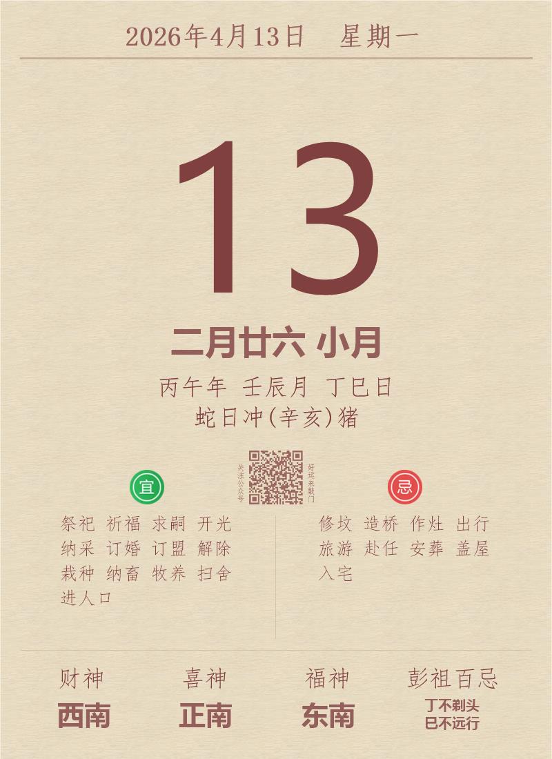 今日老黄历(2026年4月13日):黄历宜忌、财神方位、特吉生肖、打麻将财位